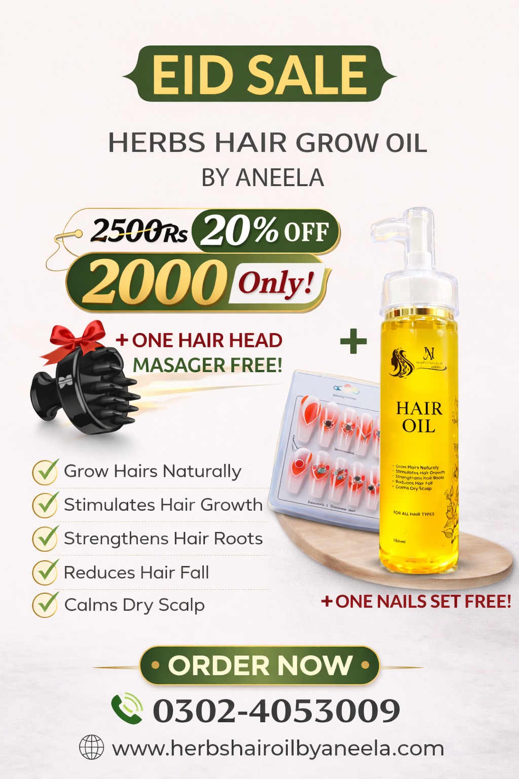 Aneela’s Herbal Hair Grow Oil With 1Head Massager And 1 Press On Nail Set Free