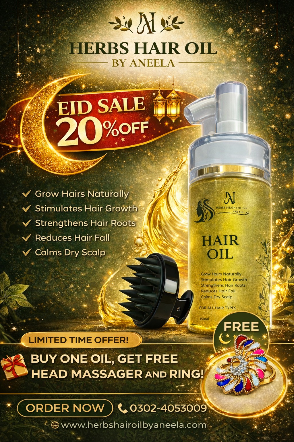 Discover the power of nature with Herb Hair Grow Oil by Aneela — a premium herbal formula specially crafted to nourish your scalp, reduce hair fall, and promote healthy hair growth. Made with a unique blend of natural herbs and essential oils, this lightweight, non-sticky oil deeply penetrates the roots to strengthen hair from within.