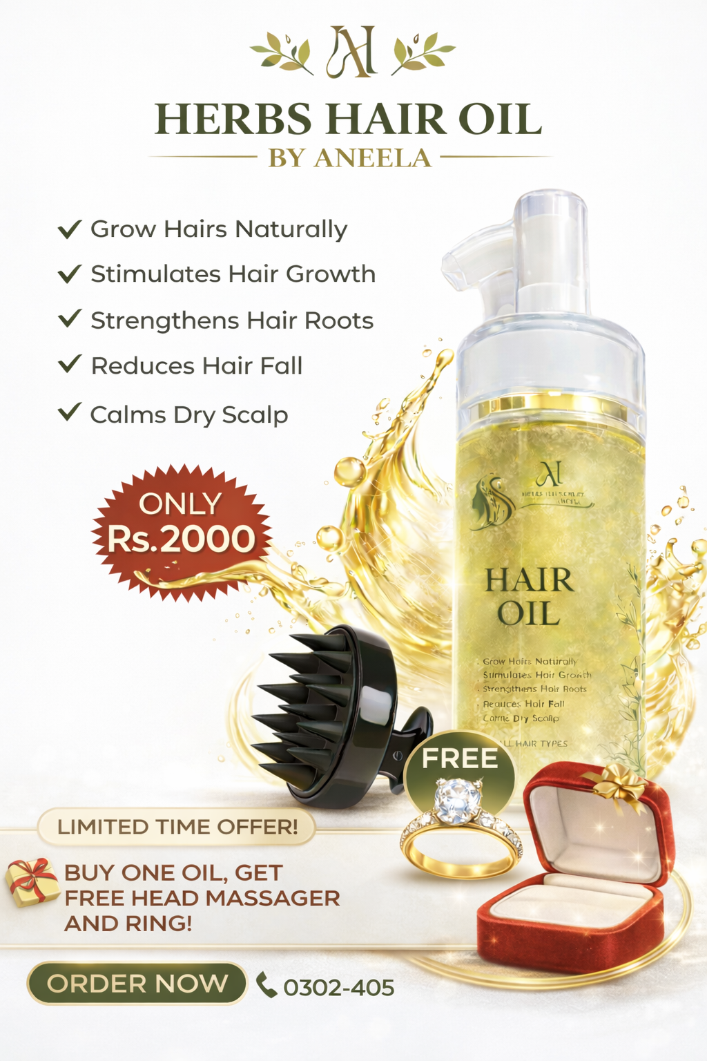 Aneela’s Herbal Hair Grow Oil With 1Head Massager And 1 Press On Ring Free